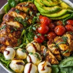 The air fills with irresistible aromas as the marinated chicken sizzles in the oven, infusing your kitchen with warm, savory notes. Picture juicy bites of chicken, seasoned to perfection, nestled among vibrant greens and glistening, creamy mozzarella. Each forkful offers a delightful crunch of fresh tomatoes and buttery avocado, dancing together in a celebration of flavors. The tang of the homemade balsamic vinaigrette ties it all together, creating a harmonious blend that feels both indulgent and uplifting.