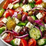 A vibrant Greek salad bursting with fresh flavors, featuring crisp cucumbers, juicy tomatoes, Kalamata olives, and creamy feta, perfectly dressed with a tangy vinaigrette.