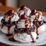 Keywords: Black Forest Pavlova Bombs, meringue dessert, chocolate pavlova, cherry dessert, gluten-free dessert, whipped cream, chocolate ganache, holiday desserts, easy pavlova recipe, elegant desserts, party desserts, sweet treats, festive desserts, light desserts