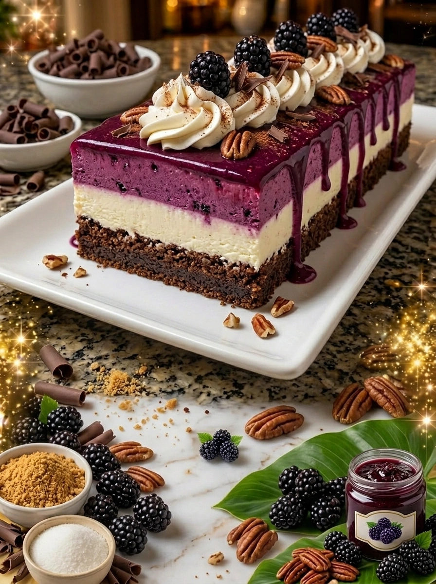 - Spread the blackberry mousse over the cheesecake layer and refrigerate for an additional 4 hours or until set.