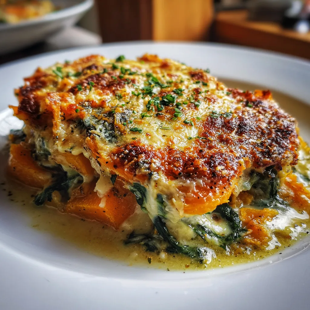 A delicious and comforting gratin made with butternut squash and spinach, perfect for a cozy meal.