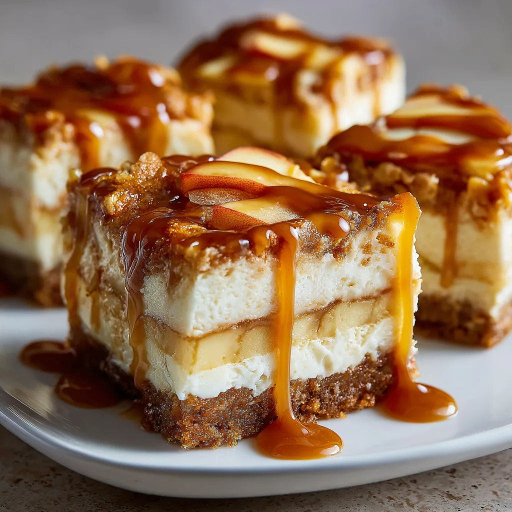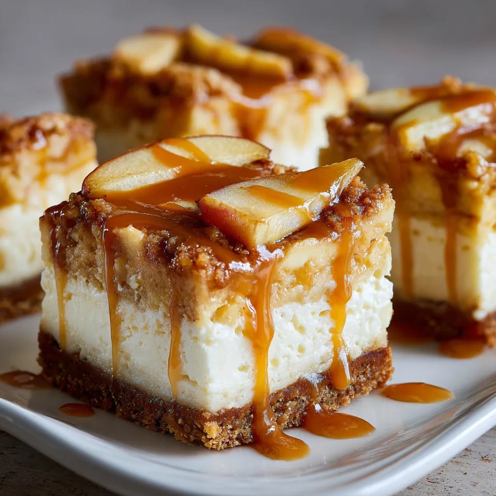 Delicious caramel apple cheesecake bars that combine the flavors of creamy cheesecake, sweet caramel, and tart apples for a delightful dessert.