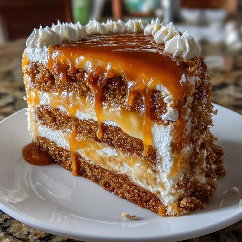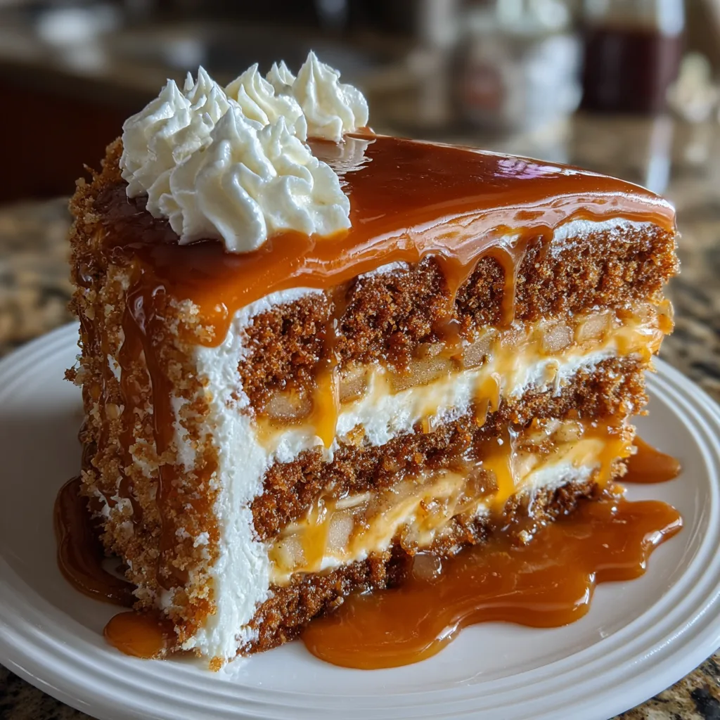 A delightful and moist caramel apple layer cake that combines the flavors of sweet apples and rich caramel for a perfect dessert.