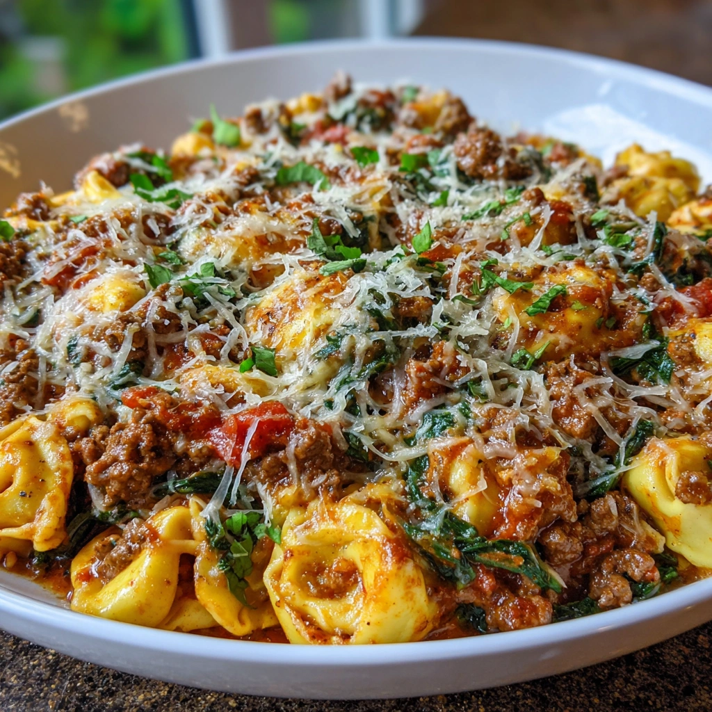 Keywords: Cheesy Beef & Spinach Tortellini Casserole, Italian casserole, cheesy pasta bake, beef and spinach recipe, comfort food, easy dinner, family meal, one-dish recipe, baked tortellini, creamy casserole