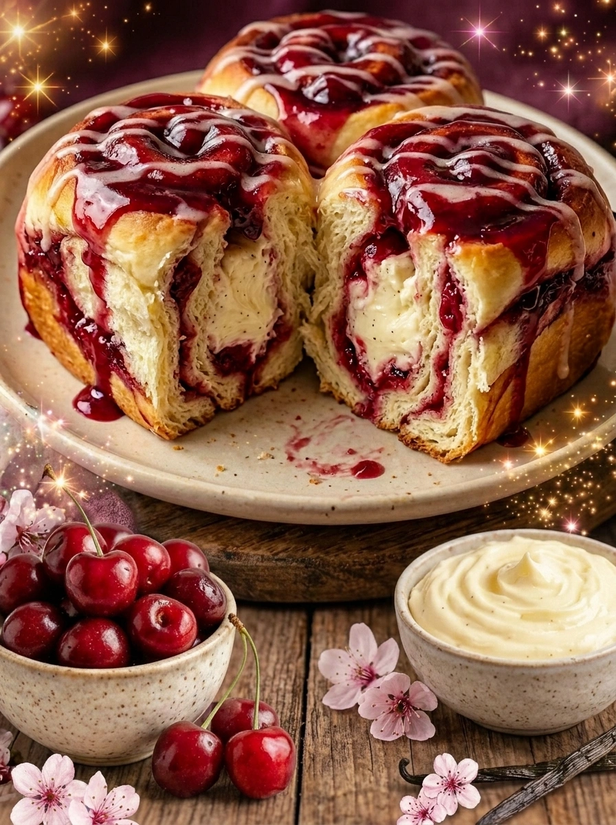 - Cool and Serve: Once the rolls are done, let them cool slightly before drizzling with the cherry topping.