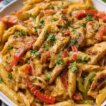 A creamy and vibrant pasta dish that combines the flavors of fajitas with classic pasta, featuring chicken, peppers, and a rich sauce.