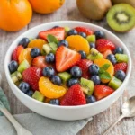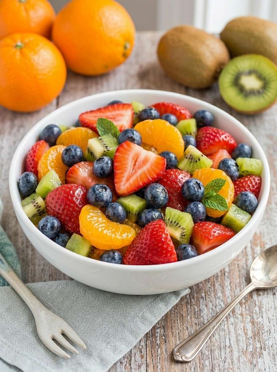 - Prepare the Fruits: In a large mixing bowl, combine 1 cup of hulled and sliced strawberries, 1 cup of fresh blueberries, 1 cup of peeled and segmented mandarin oranges, and 1 cup of peeled and diced kiwi.