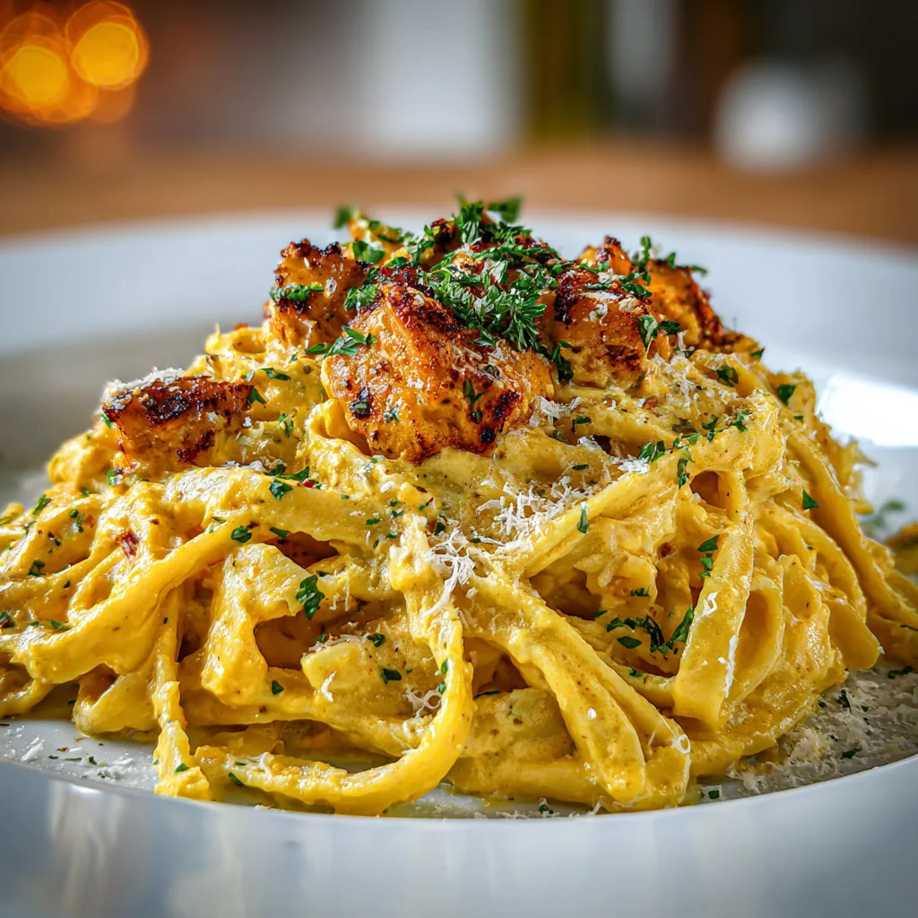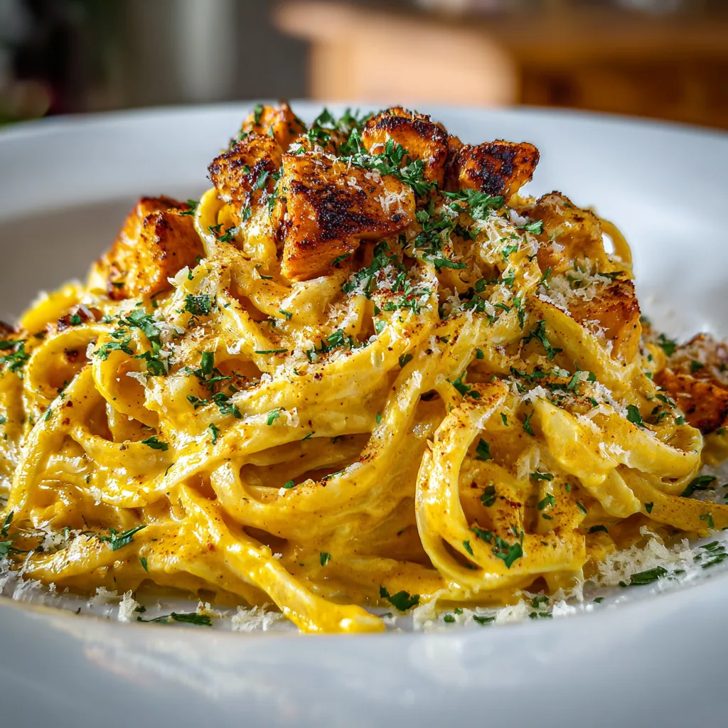 A rich and creamy pasta dish made with pumpkin and Alfredo sauce, perfect for fall.