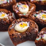 A playful twist on classic brownies, featuring a fudgy base topped with creamy frosting and colorful sprinkles, mimicking the look of deviled eggs.