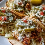 Delicious tacos filled with seasoned ground chicken, crispy dill pickles, and creamy ranch dressing, all wrapped in warm tortillas.