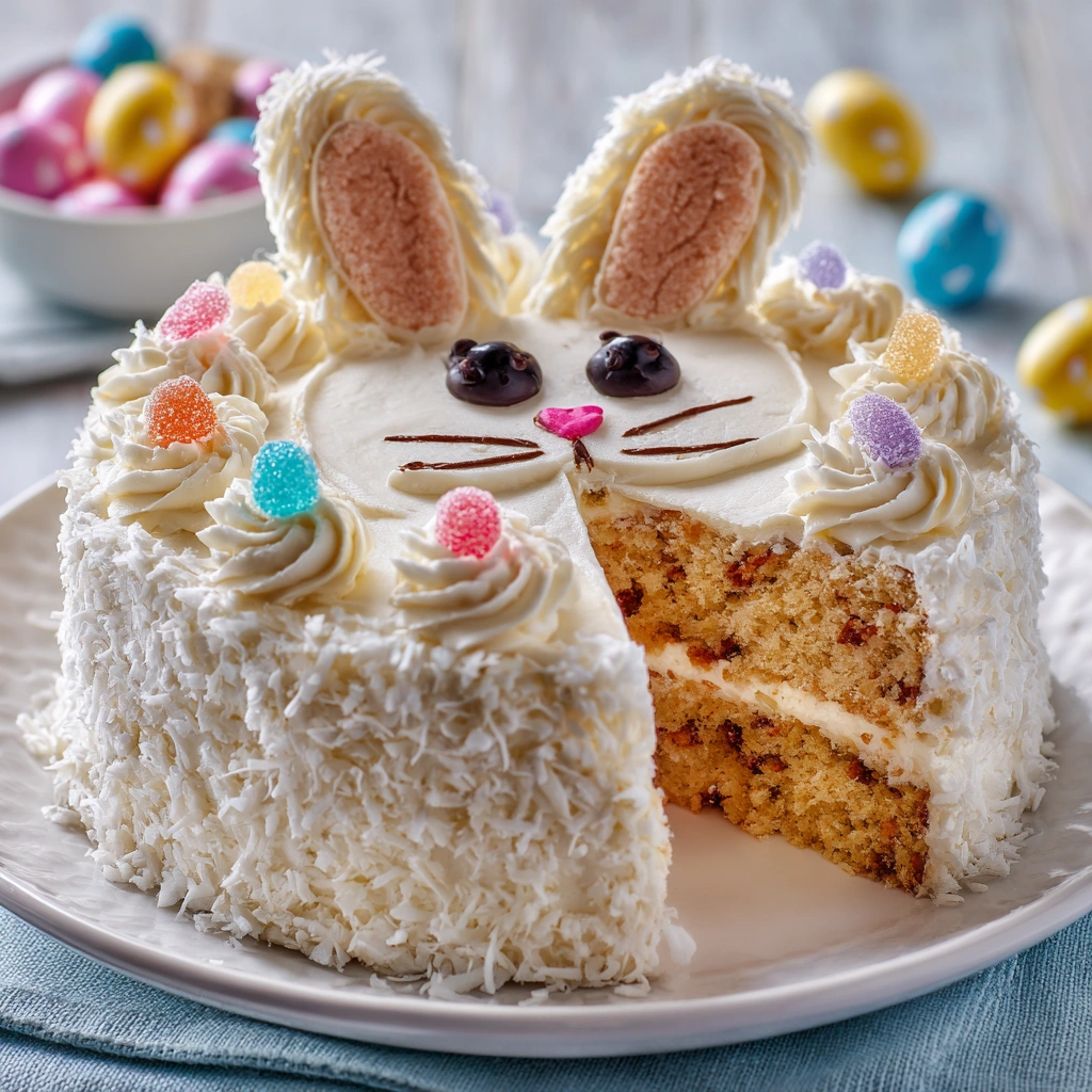 Keywords: Easter Bunny Cake, Easter dessert, festive cake, spring cake, bunny cake, vanilla cake, cream cheese frosting, holiday baking, cute cake, family dessert, celebration cake, whimsical cake, decorated cake, cake recipe, seasonal dessert