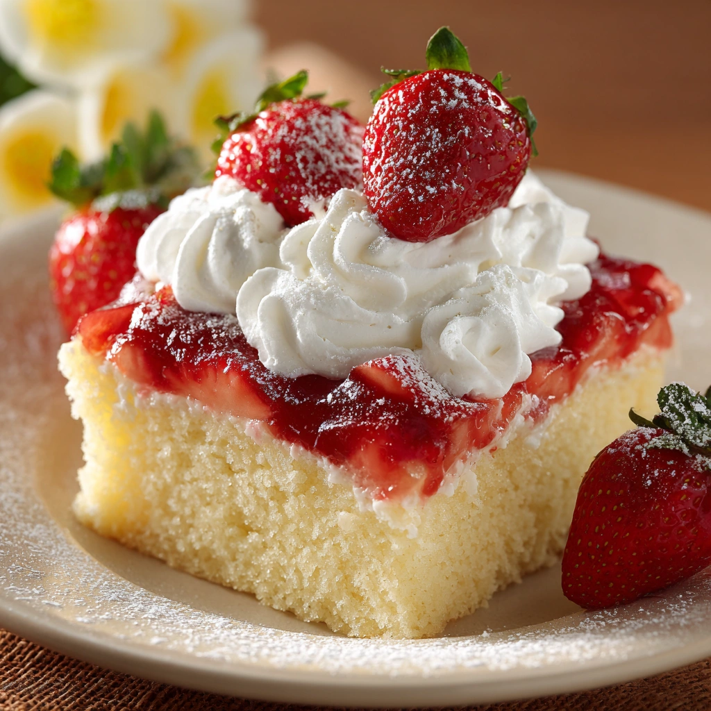 - Top the Cake: Spread the whipped cream topping over the cooled cake and garnish with additional strawberries. Refrigerate for at least 2 hours before serving.