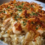 Imagine a cozy evening as the sun sets, and your kitchen fills with the warm, savory scent of caramelized onions mingling with tender chicken and rich cheese—a gentle embrace for your senses. This is no ordinary dish; this is a French Onion Chicken Rice Bake, an exquisite fusion that brings together comfort, nostalgia, and irresistible flavor. Every bite offers a perfect balance of creamy and crispy textures, a delightful contrast that makes your taste buds dance with joy. The crispy cheese topping, the warm, velvety rice, and the luscious chicken create a symphony that sings of home-cooked love, making it the ideal dish for family gatherings, weekend dinners, or any occasion when you want to indulge in something special.