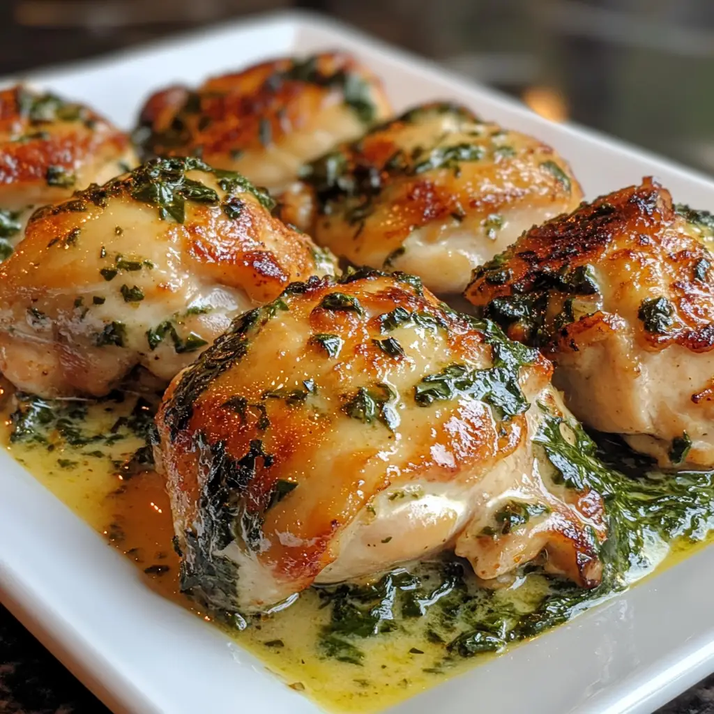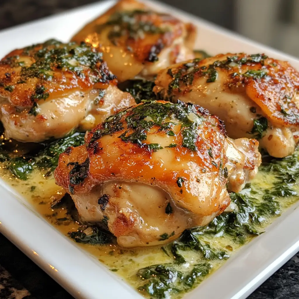 A delicious and savory dish featuring tender chicken thighs cooked in garlic butter, served with a creamy spinach side.