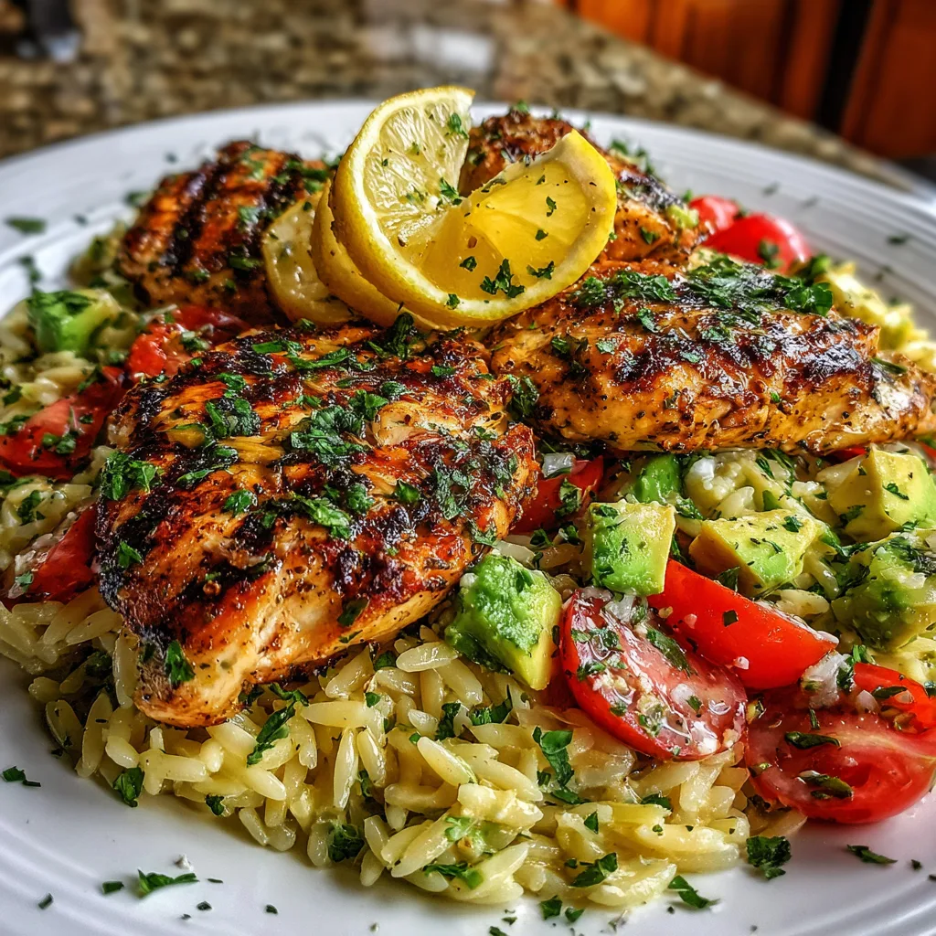 Grilled Lemon Herb Chicken Avocado Orzo Salad Delights!