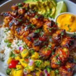 - Assemble the Bowl: Serve coconut rice in bowls, top with grilled chicken, mango avocado salsa, and a drizzle of chili mayo. Garnish with cilantro or lime if desired.