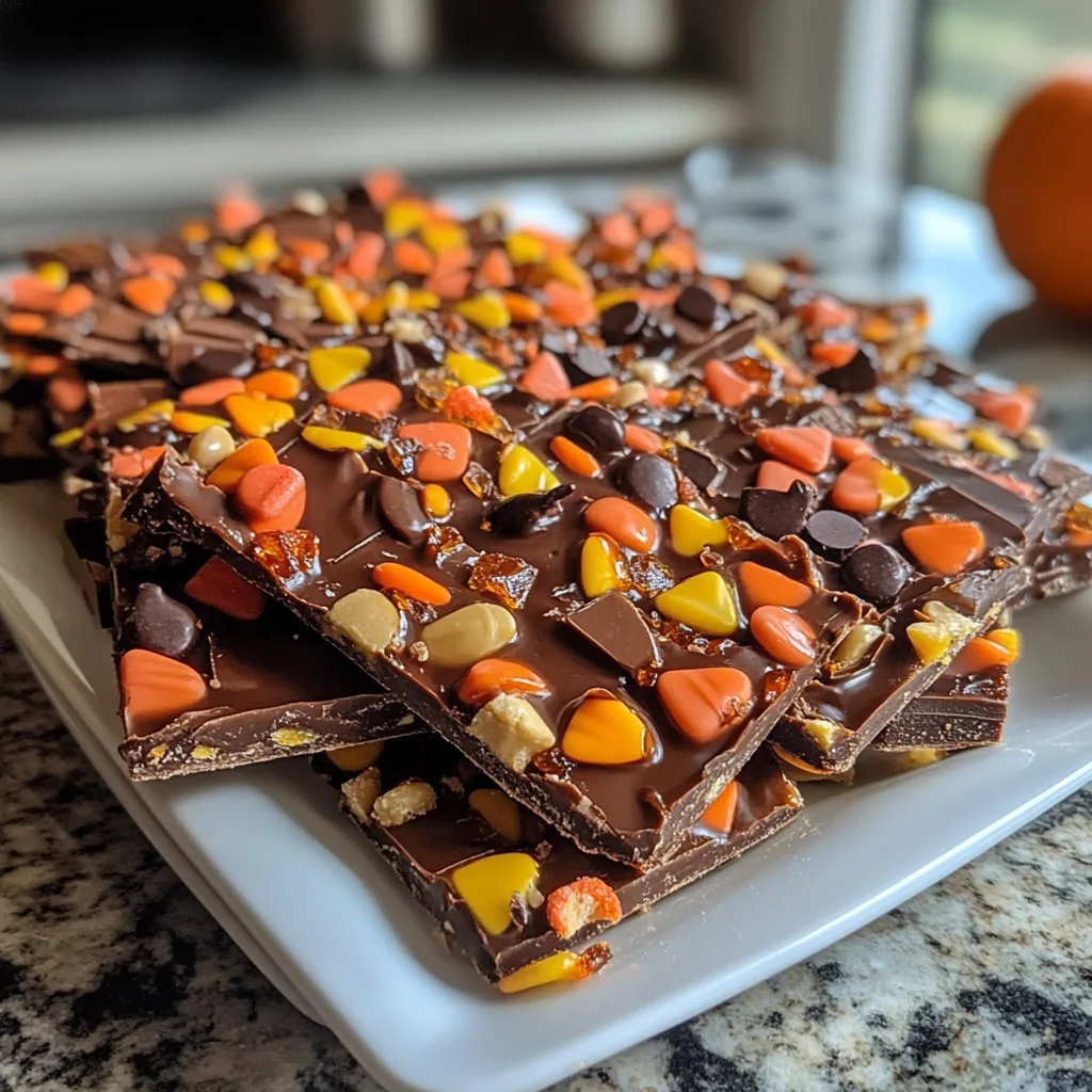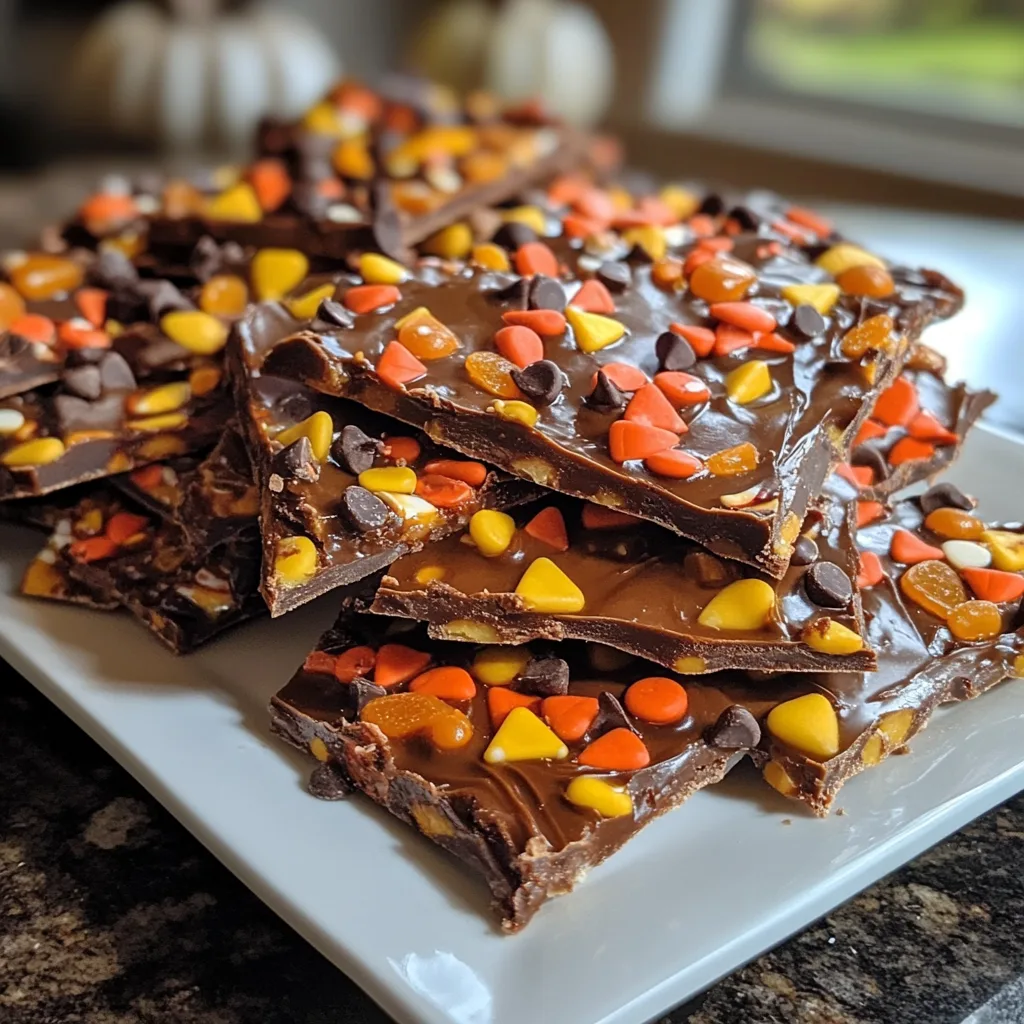 A delightful and festive treat perfect for Halloween, combining chocolate, pretzels, and candy corn.