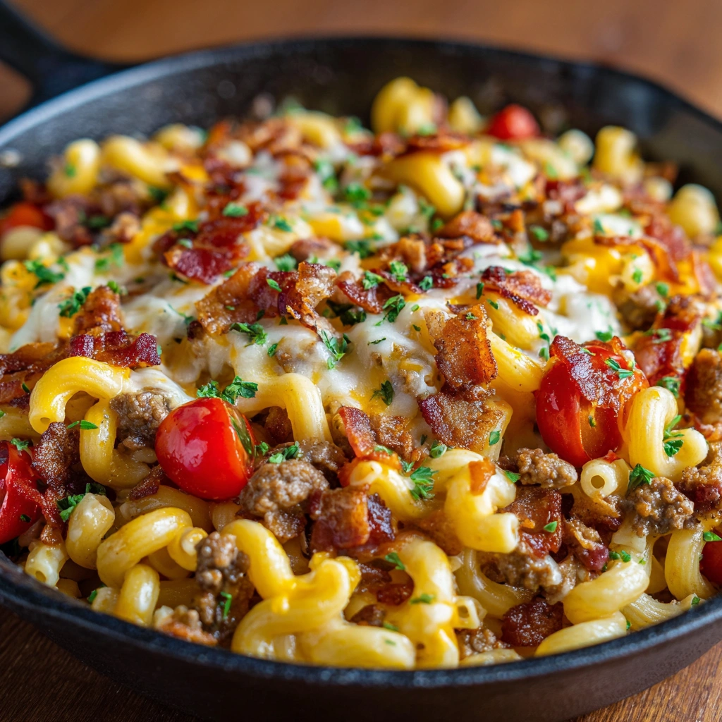 Keywords: Loaded Bacon Cheeseburger Pasta Skillet, creamy pasta, bacon pasta, cheeseburger pasta, skillet meals, easy dinner recipes, comfort food, one-pot meals, American cuisine, pasta recipes, quick meals, family-friendly recipes, hearty pasta dishes