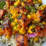 - Layer cooked rice in bowls, top with salmon bites, and spoon mango salsa over the fish.