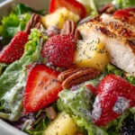 A refreshing and vibrant salad featuring juicy strawberries, sweet pineapple, crunchy pecans, and a creamy poppyseed dressing, perfect for sunny gatherings.