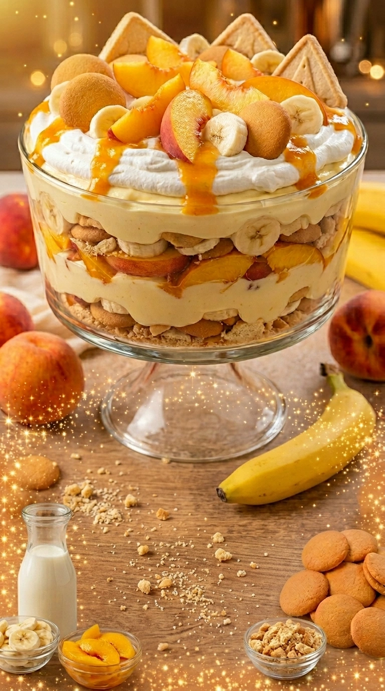 This recipe layers silky homemade vanilla pudding with ripe banana slices, juicy peaches, pillowy whipped cream, and tender cookies into a dessert that requires zero baking, minimal technique, and absolutely maximum reward. It’s the kind of dish that looks like you spent all day in the kitchen — but most of that time is simply the refrigerator doing the work while you relax.