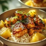 This dish doesn’t just satisfy cravings; it evokes warmth, nostalgia, and that cherished feeling of home-cooked comfort. Picture yourself seated around the dinner table with loved ones, laughter filling the air, as you serve this colorful plate adorned with fragrant herbs. The laughter mingles with the sounds of you and your family eagerly scooping up this vibrant meal, the enticing fragrance of soy sauce and garlic drawing everyone in. Pineapple Chicken and Rice goes beyond ordinary weeknight dinners, elevating any occasion to a celebration.