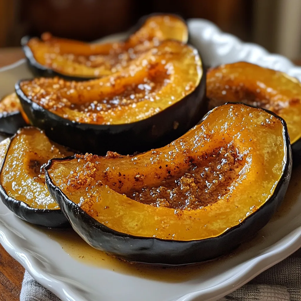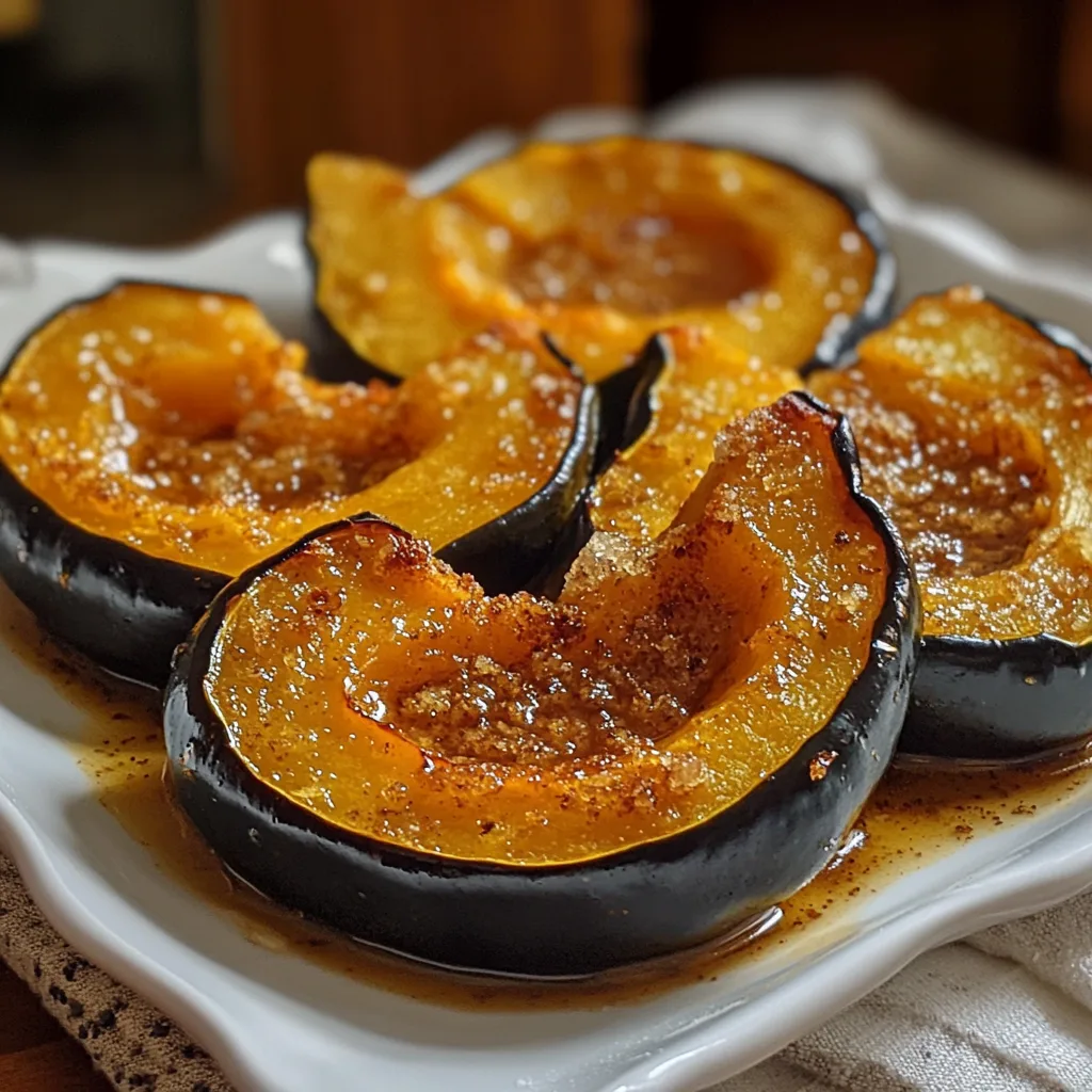 A delicious and sweet side dish featuring roasted acorn squash drizzled with a rich brown sugar butter.