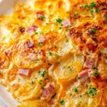 A comforting dish of tender potatoes layered with savory ham and rich melted cheese, baked to golden perfection.