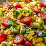 The salad greets you with a symphony of flavors. Crisp, sweet corn kernels pop with joy, and halved cherry tomatoes burst with tangy juiciness, transporting you straight to sun-soaked gardens. The sharpness of finely chopped red onion mingles with the bright, herbal accents of fresh cilantro, creating a refreshing balance that makes you want to reach for just one more bite. A zesty splash of lime juice ties everything together, cutting through the richness of the avocado and adding a vibrant citrusy punch that dances on your palate. This salad isn’t just food; it’s a sensory experience, a burst of summer goodness you can savor with friends and family during lazy afternoons or lively gatherings.
