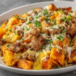 A hearty and flavorful breakfast casserole featuring sweet potatoes and sausage, perfect for a satisfying morning meal.