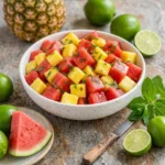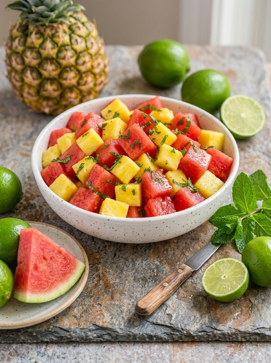 Keywords: Watermelon Pineapple Fruit Salad, summer salad, refreshing fruit salad, healthy dessert, tropical fruit salad, easy fruit salad recipe, no-cook salad, hydrating salad, picnic food, gluten-free salad, fruit salad with mint, light summer dish, fruit salad recipe